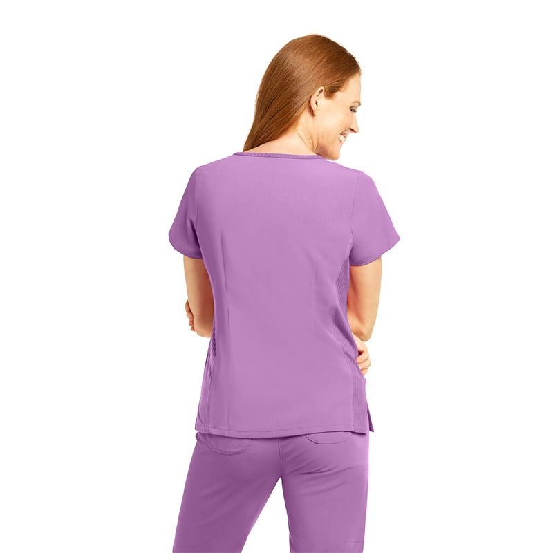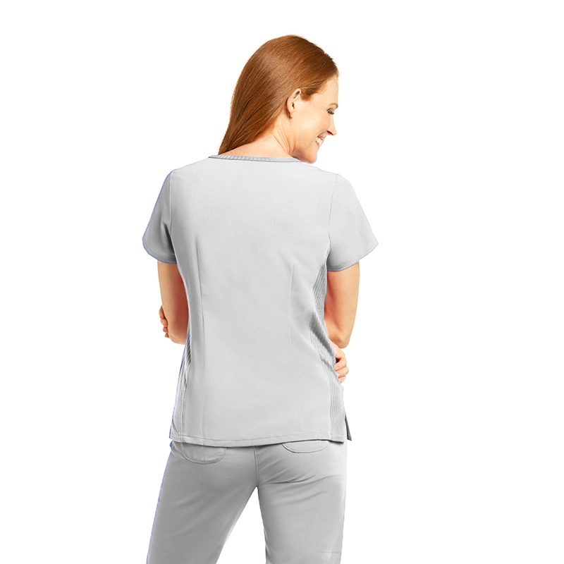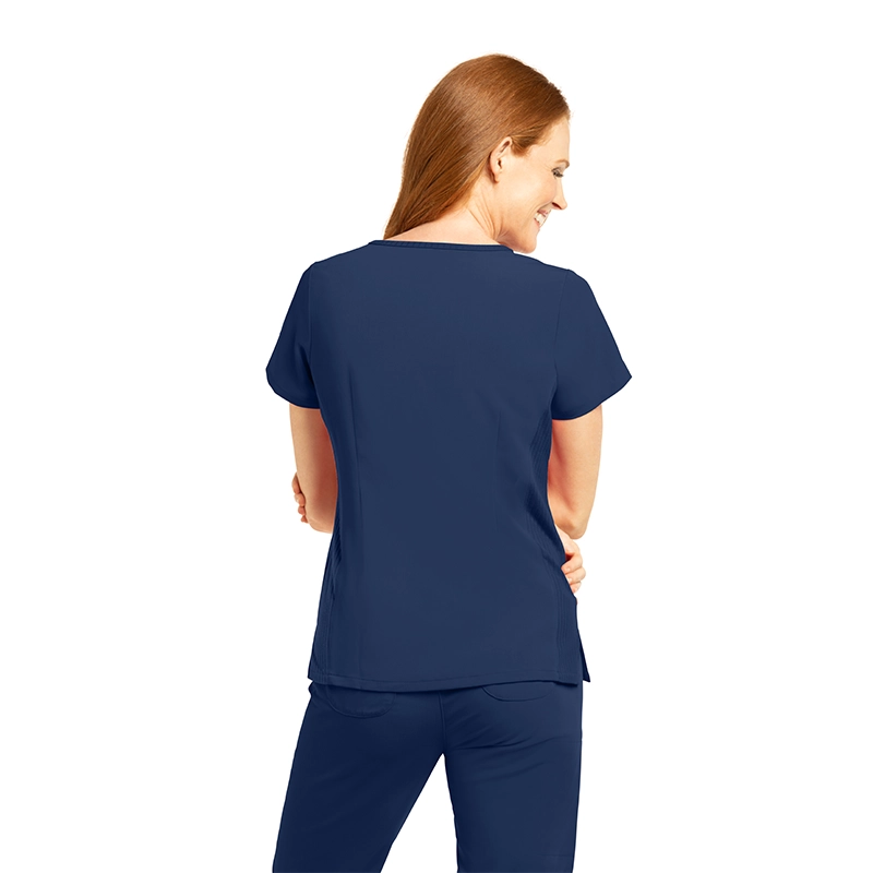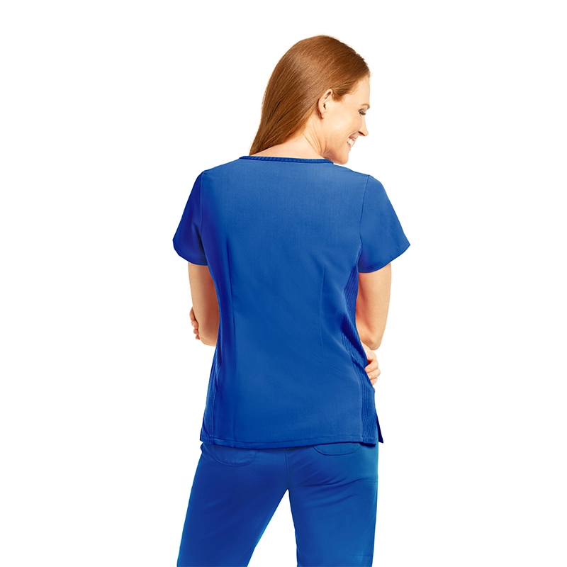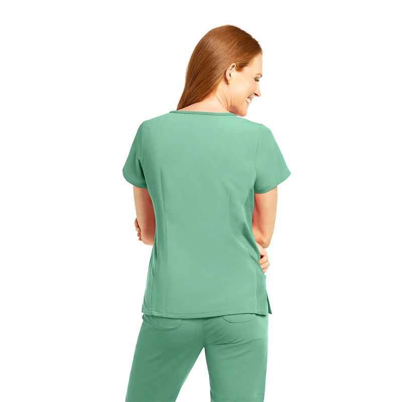 Fabricado con 44% poliéster, 26% poliéster reciclado, 22% rayón y 8% spandex, un tejido transpirable, elástico y sostenible, ideal para largas jornadas.