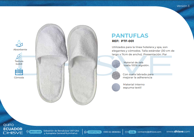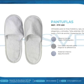 Utilizados para la línea hotelera y spa, son elegantes y cómodos. Talla estándar (30 cm de largo x 11cm de ancho). Presentación: Par