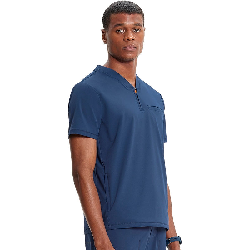 Diseño moderno con escote en V y cremallera parcial, ofreciendo un ajuste versátil y profesional.